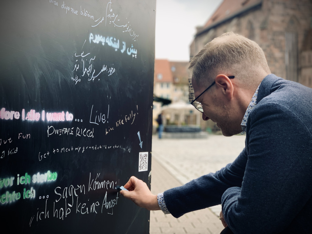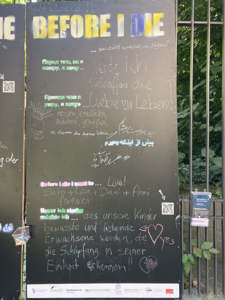 Seit Anfang Mai war das Projekt auf Tour durch Nürnberg: Nach dem Auftakt bei der Agentur für Arbeit, stand es bis 16.Juni auf dem Karl-Bröger-Platz vor der AWOthek. Zur Lichtenhofer Kerwa zog es dann vor die Gustav-Adolf-Gedächtniskirche/ Südstadtbad und an den Helmut-Herold-Platz, wo es im Rahmen der "KommVorZone" vor St. Markus zum Einsatz kam. Anfang Juli waren wir selbst, gemeinsam mit der Evang. Familienbildungsstätte FBS in der Leonhardstr. 13 Gastgebende, bevor die Tafeln dann vor Bayern größter Moschee, der DITIB-Moschee in der Kurfürstentstraße aufgestellt wurden. Im August fand das Projekt einen Platz im Rahmen der Kindertheaterwoche der SinN-Stiftung (unter Koordination von Sabine Arnold) in der Martin-Niemöller-Gemeinde in Langwasser, dann beim "Kapellen-Kino" in der Südstadtgemeinde St. Peter. Bis Ende September waren Menschen in Gitzenhof, rund um den Diana Stadtteilladen und Diana-Kinderhort eingeladen, ihre Gedanken dazu zu teilen, was im Leben wirklich zählt! Weitere Stationen waren: 30.09.-2.10. Nürnberger Forum in der Villa St.Paul-FAU Nürnberg; 2.-17.10. im Foyer des Haus eckstein, Burgstr. 1-3; 18.-20.10 im Buddhistischen Zentrum Boddhi-Baum in Fürth; 21.10.-30.10. Bahai-Gemeinschaft Nürnberg, Löwenberger Str. 18, Nbg.-Altenfurt; 2.11.-14.11. Klara-Kirche Nürnberg, 14.11.-20.11. Martha-Kirche,Nürnberg; Hier fand das Projekt am 20.11.,19 Uhr mit einer religionsverbindenen Finissage seinen Abschluss (siehe Blog-Beitrag).