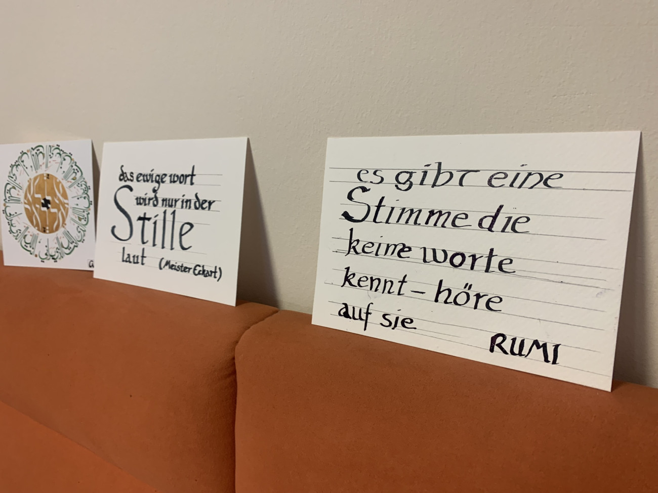 Großflächig legen wir eine Auswahl an Versen in Kopien aus: die „Schönen Namen Gottes“, beliebte Kaligraphiemotive ebenso wie bekannte Bibelverse für viele Gelegenheiten. Ein Textblatt versammelt Verse der Mystiker Meister Eckardt und Mevlevi Rumi.