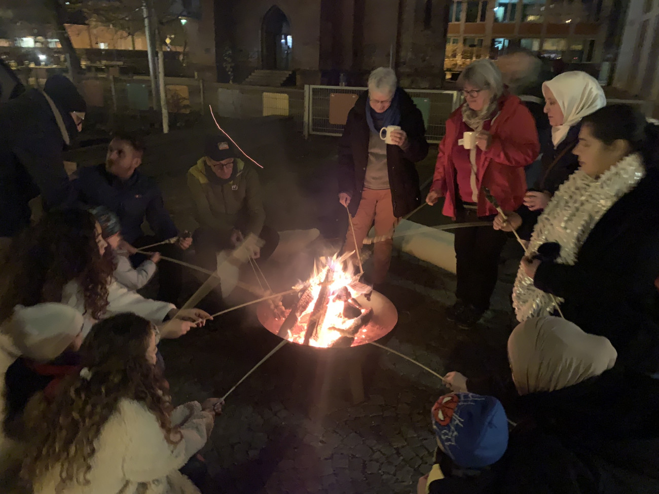 Hatten wir als BRÜCKE in früheren Jahren stets in unseren eigenen Räumen in der Evang. Familienbildungsstätte in Gostenhof eine Adventsfeier veranstaltet, so waren wir mit dieser Bewegung nach draußen und mit den Gemeinden und Menschen der Südstadt sehr zufrieden: nicht nur „Lebkuchen und Baklava“ sind sich an diesem Nachmittag begegnet: Es dauerte bis sich gegen halb 8 die letzten Teilnehmendem vom Feuer losreißen konnten, das einladend vor der Christuskirche brannte.