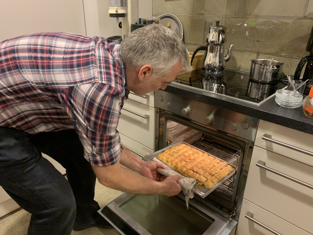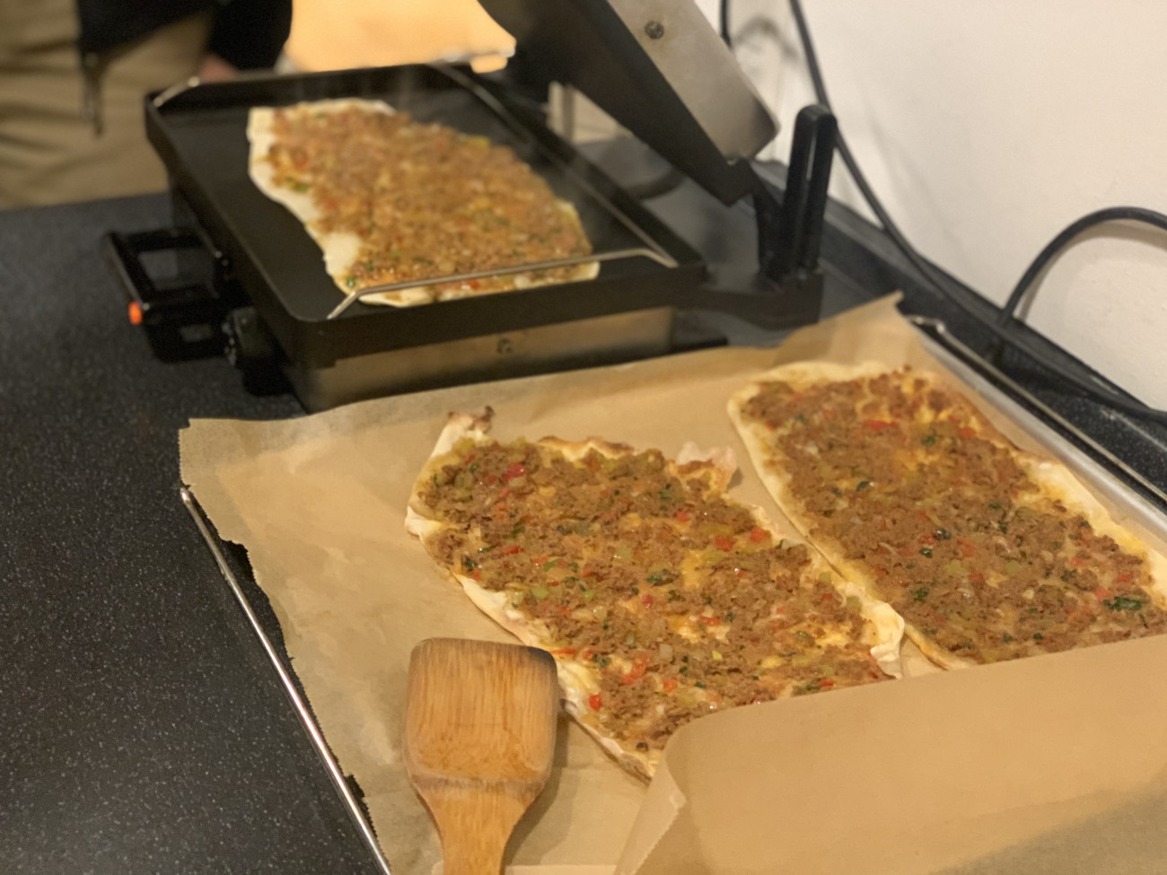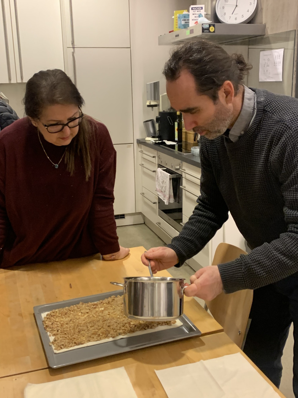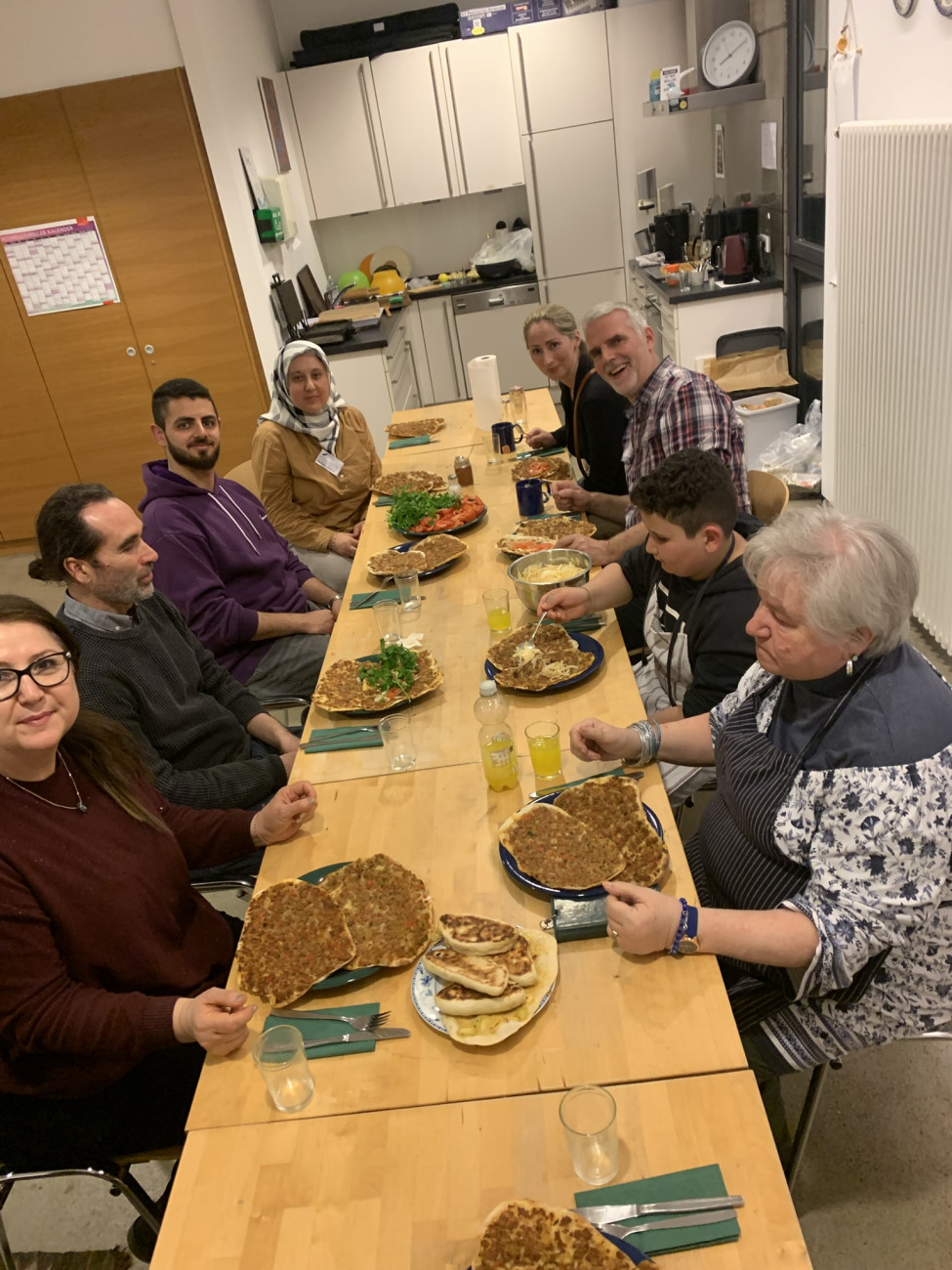 Am 26.März ging es los: Kadir und Dilek aus Erlangen zeigten uns, wie man Lahmacun und Baklava bäckt. Ein Fest für alle Sinne, mit Begegnungen zwischen jung und alt, Süßem und Herzhaftem, Raum auch zum Deutschsprechen und ein wenig auch zum Türkischlernen. Herzlichen Dank vor allem an unsere beiden leidenschaftlichen Vorköche und alle Mitschnippler, Teigausroller und Mit-Genießer*innen!