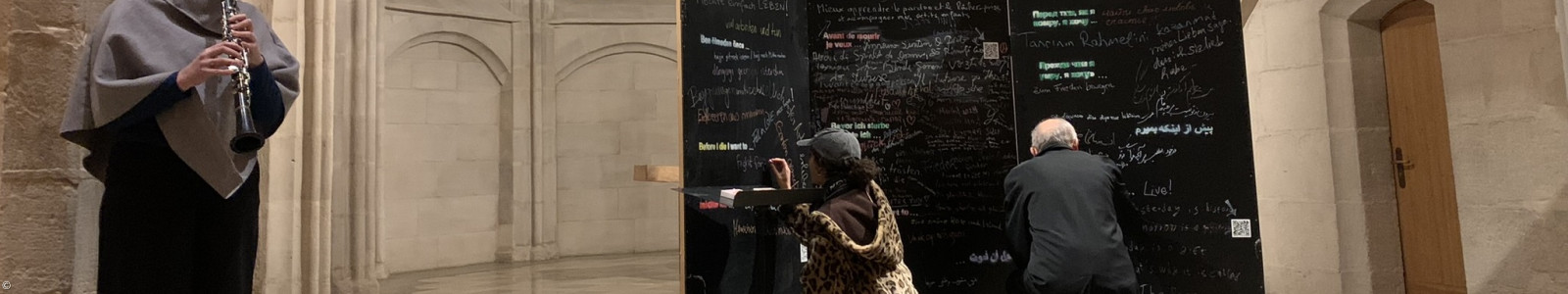 Gerahmt wurde die Finissage von a-capella gesungenen Psalmen eines kleinen Quartetts aus der Gemeinde St. Martha, Klarinettentönen von Franka Böhm und persischer Percussion von Atefeh Azad. Dazu waren abschließend noch einmal alle Besuche eingeladen, ihren persönlichen Satz auf die Tafeln zu schreiben, die eindrucksvoll im ansonsten leeren Altarraum der reformierten Kirche standen. Eine Mitsing-Performance öffnete den Abend dann zu einem offenen Ausklang bei Tee und Keksen im Kirchenraum. Eindrücke und viele Fotos von den Tafeln findet man unter: https://www.bruecke-nuernberg.de/i-die-das-interaktive-streetart-mitmachprojekt-i-die-geht-auf-tour-durch-nuernberg