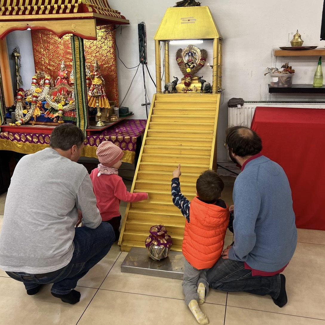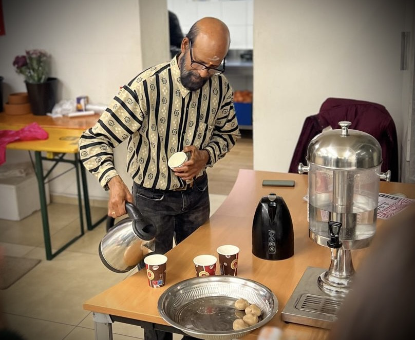 Die Vorstände des Tempels begrüßten die Gäste herzlich und erzählten von der tamilisch-hinduistischen Gemeinschaft, ihrem Glaubensleben und ihren Festen. Auch hier spielte das gemeinsame Essen eine Rolle: Für die Besucherinnen und Besucher gab es ein süßes, gedämpftes Gebäck, das mit Kokos und Kardamom gefüllt ist, sowie Chai.